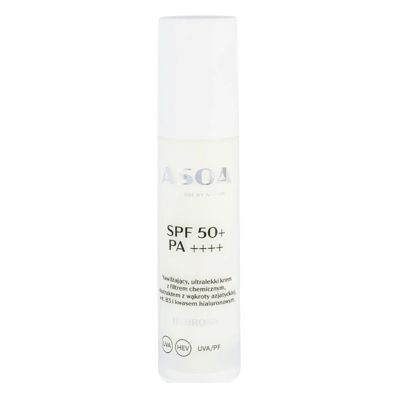 Krem nawilżający z filtrem chemicznym SPF 50+ PA++++ ASOA to lekki i intensywnie nawilżający kosmetyk, który zapewnia najwyższą ochronę przed promieniowaniem UVA i UVB. Szybko się wchłania, nie pozostawiając białej warstwy ani tłustego filmu, dzięki czemu idealnie sprawdza się w codziennej pielęgnacji każdego rodzaju cery.
