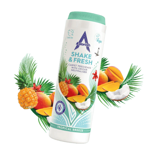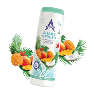 Astonish Proszek do Dywanów – Tropikalny to praktyczne i szybkie rozwiązanie do odświeżania dywanów, wykładzin i wnętrz samochodów. Neutralizuje nieprzyjemne zapachy i pozostawia trwały, egzotyczny aromat tropikalnych owoców, tworząc przyjemną atmosferę w domu – bez konieczności prania tekstyliów.