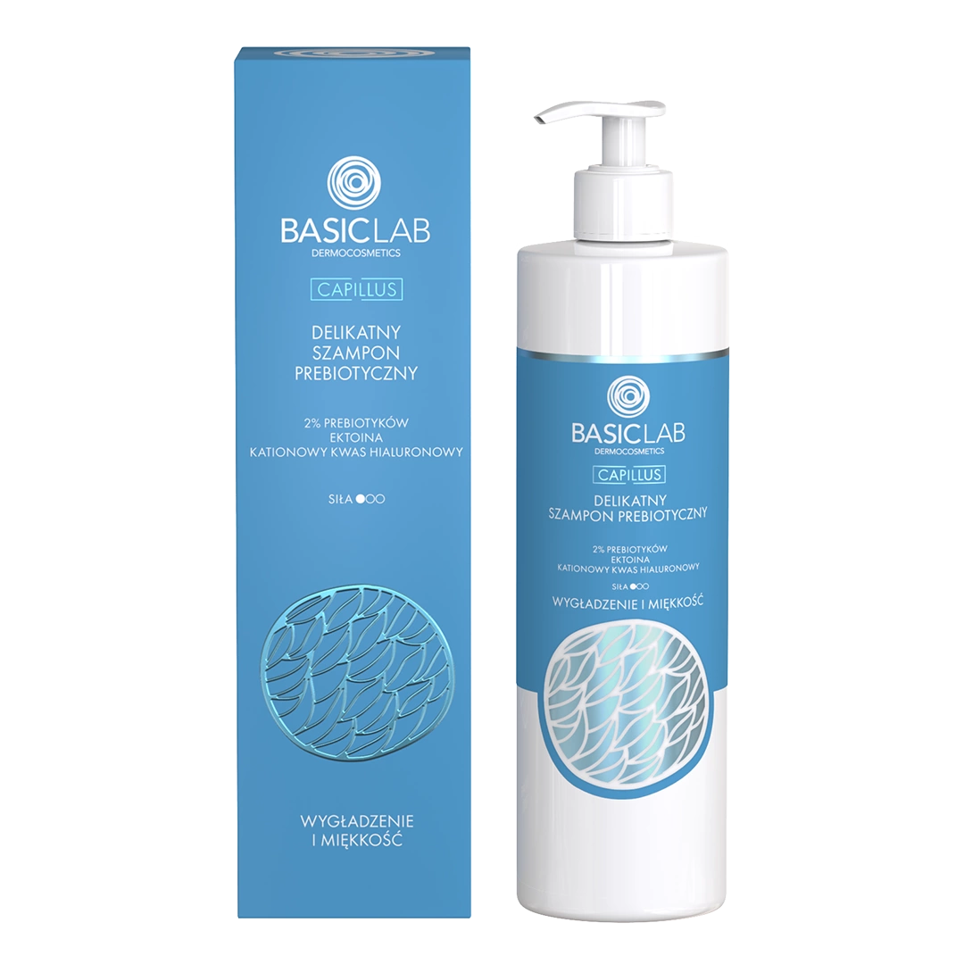 BASICLAB Delikatny szampon prebiotyczny 2% prebiotyków, ektoina, kationowy kwas hialuronowy, Wygładzenie i Miękkość 300ml