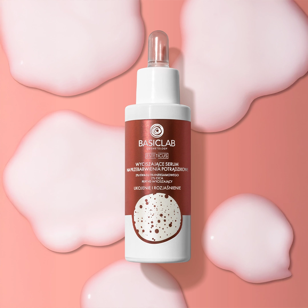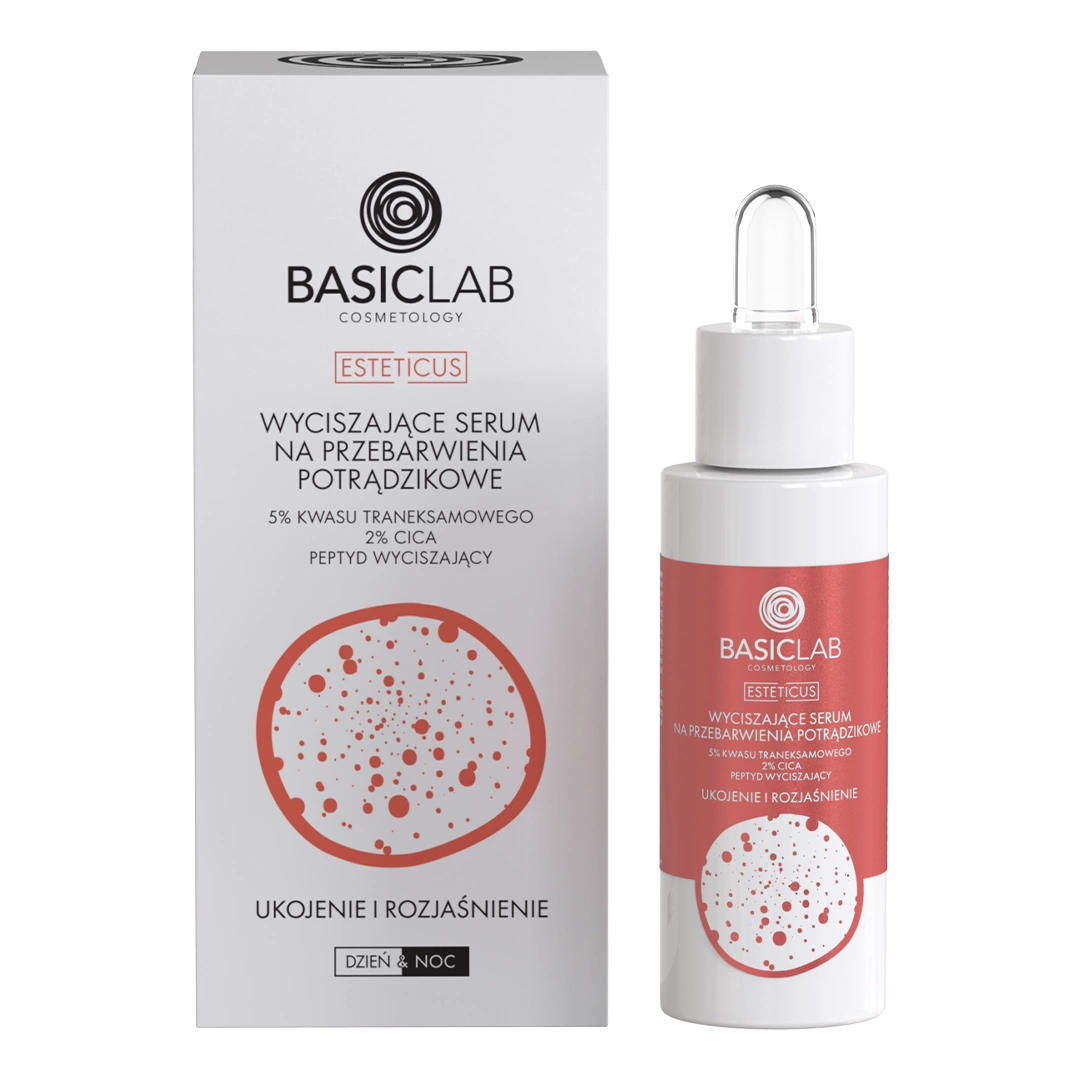 BASICLAB Wyciszające serum na przebarwienia potrądzikowe, 5% kwasu traneksamowego, 2% CICA, peptyd wyciszający, Ukojenie i Rozjaśnienie 30 ml