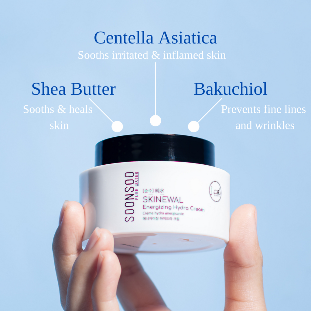 Soonsoo Skinewal Energizing Hydra Cream to wielozadaniowy krem, który intensywnie nawilża, wspiera elastyczność i wygładza skórę. Połączenie bakuchiolu, Centelli azjatyckiej i masła shea przynosi ukojenie oraz pomaga redukować drobne linie.