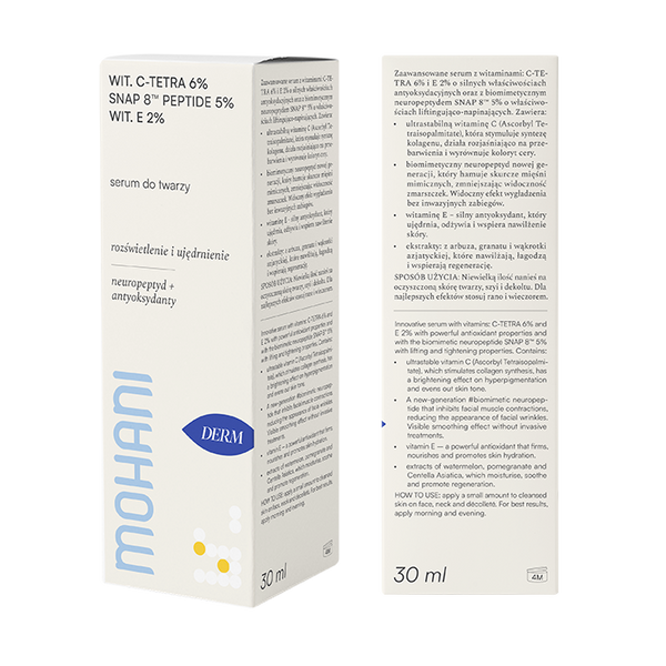 MOHANI Napinająco-rozświetlające serum do twarzy z ultrastabilną Witaminą C TETRA 6%, neuropeptydem SNAP 8™ 5% i Witaminą E 2% 30ml
