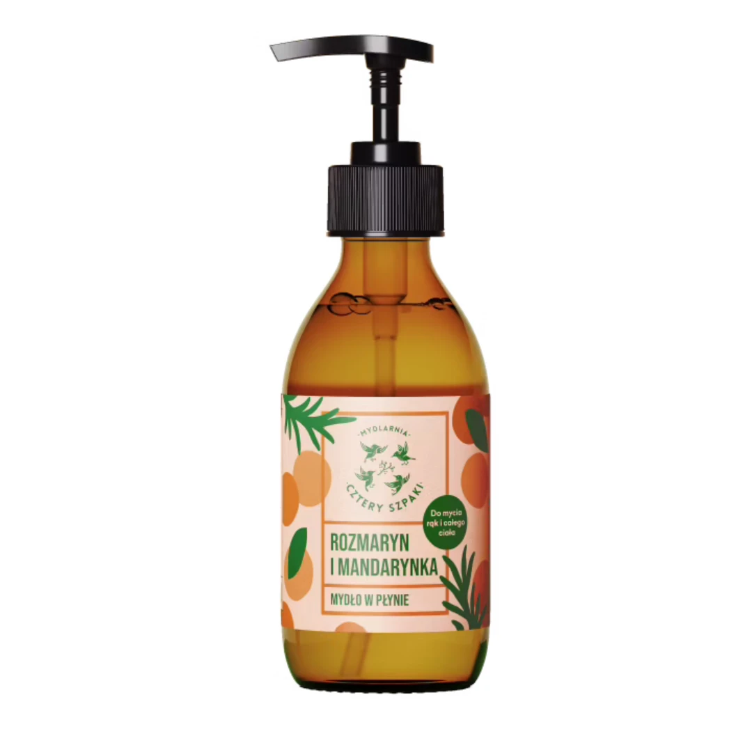Rozmaryn i Mandarynka to naturalne mydło w płynie o przyjemnie żelowej konsystencji, które tworzy gęstą, kremową pianę. Powstaje w autorskiej technologii łączącej klasyczne mydło z łagodnymi detergentami roślinnymi, dzięki czemu skutecznie oczyszcza, dbając o komfort skóry.