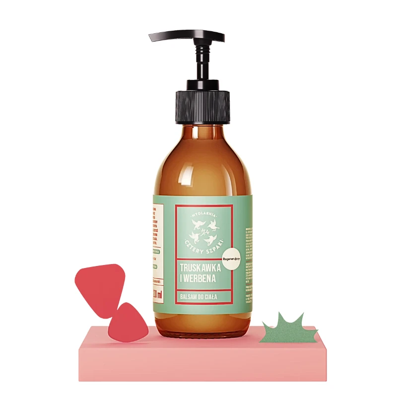 Regenerujący balsam do ciała Truskawka i Werbena od Mydlarni Cztery Szpaki to bogata mieszanka maseł i olejów roślinnych, wzbogacona witaminą E, olejkiem truskawkowym i werbenowym. Skutecznie wzmacnia, regeneruje i odżywia skórę, pozostawiając ją miękką i pachnącą świeżymi owocami z nutą ziołową.