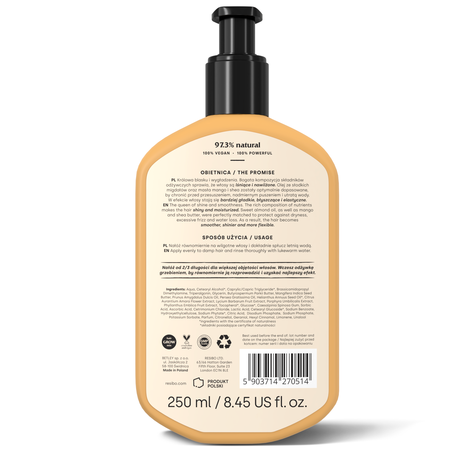 - Wygładzenie i blask: Innowacyjny emolient tripelargonin zapewnia jedwabiste wykończenie, wygładza łuskę włosa i dodaje naturalnego blasku bez obciążania.