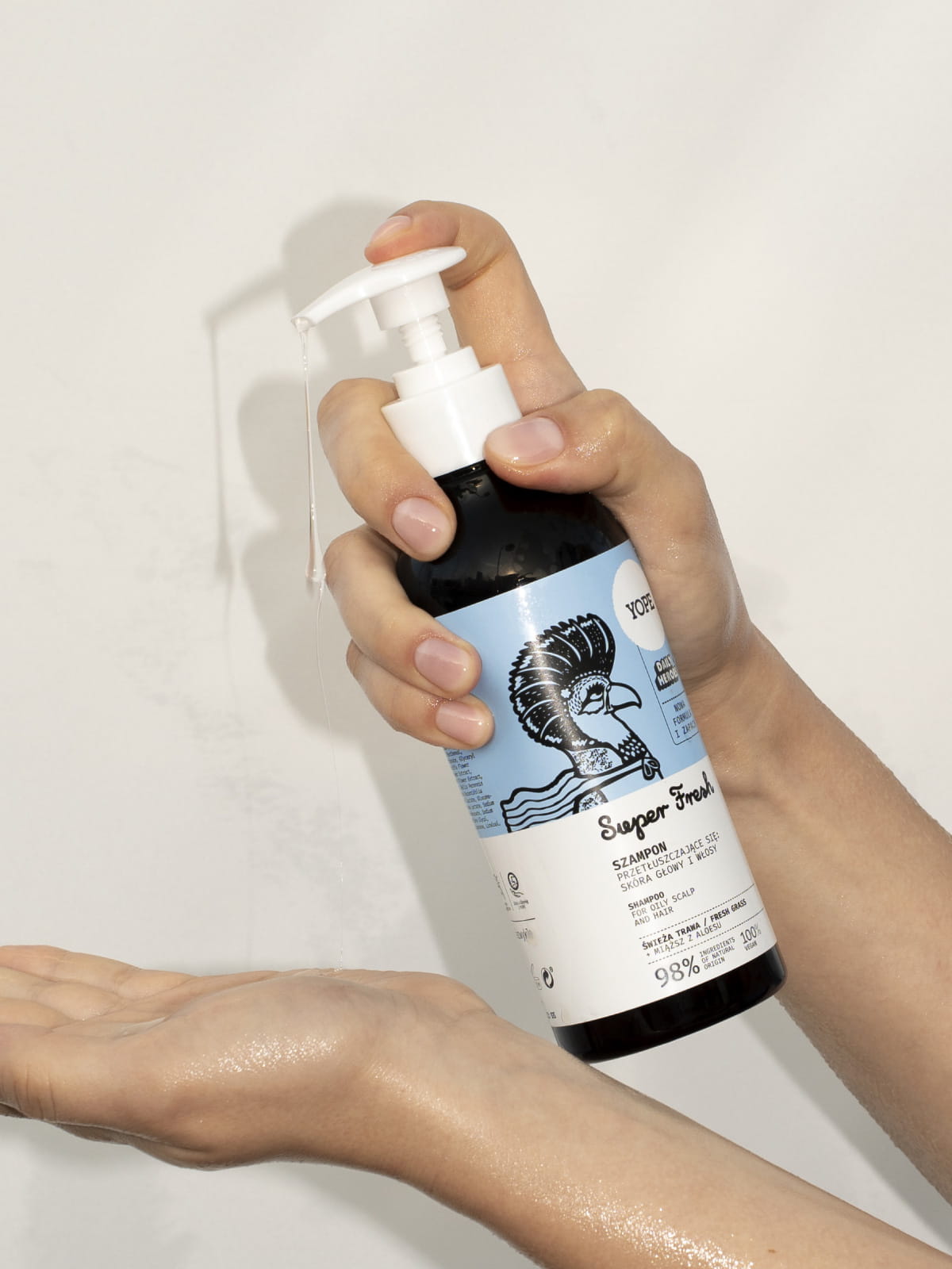 Super Fresh z linii DAILY HEROES to szampon stworzony specjalnie dla osób z przetłuszczającą się skórą głowy i włosami. Nowa, ulepszona formuła nadaje włosom lekkości, miękkości i świeżości, bez efektu obciążenia. Delikatne roślinne składniki myjące dbają o równowagę skóry głowy, a nowy, lżejszy zapach sprawia, że codzienne mycie staje się jeszcze przyjemniejsze.