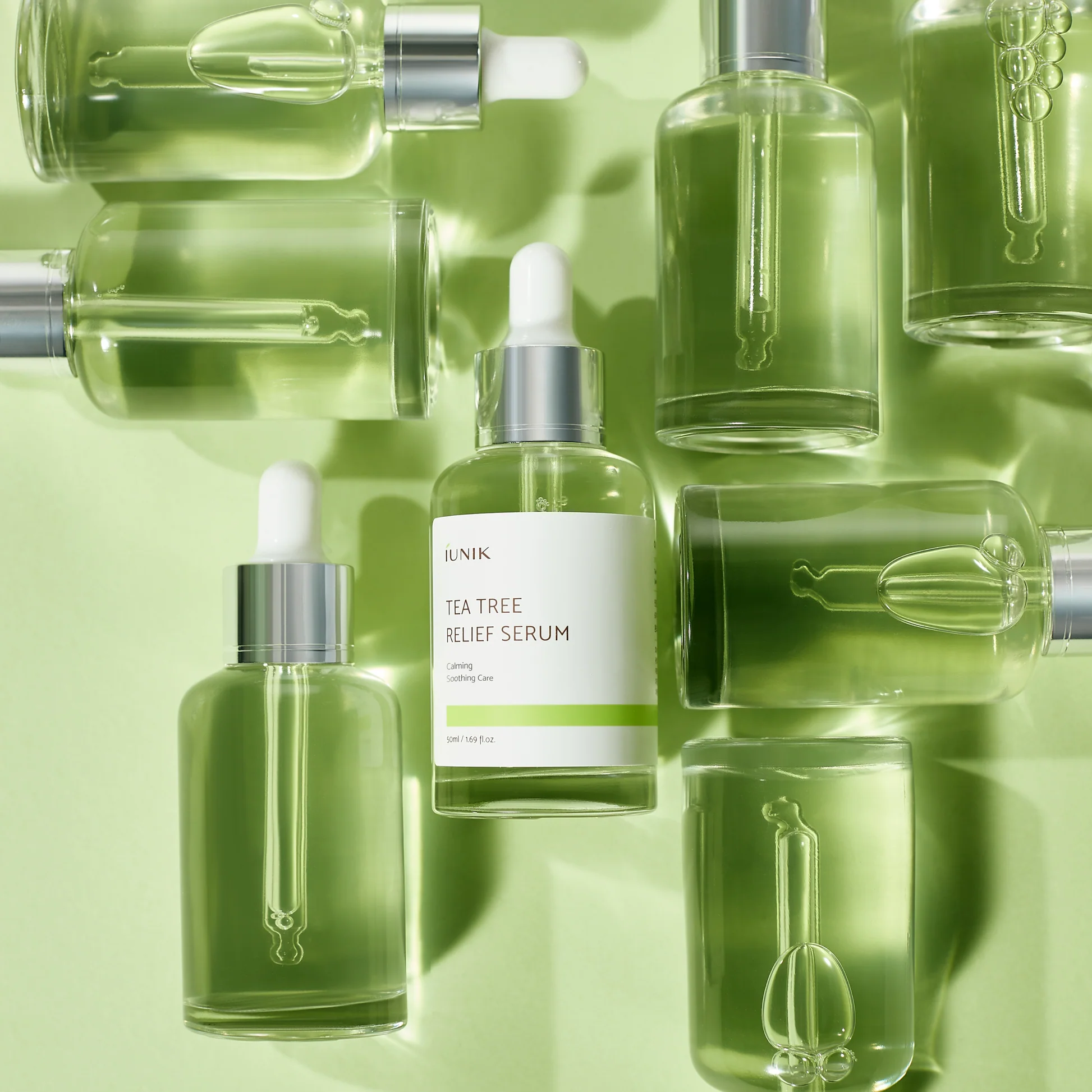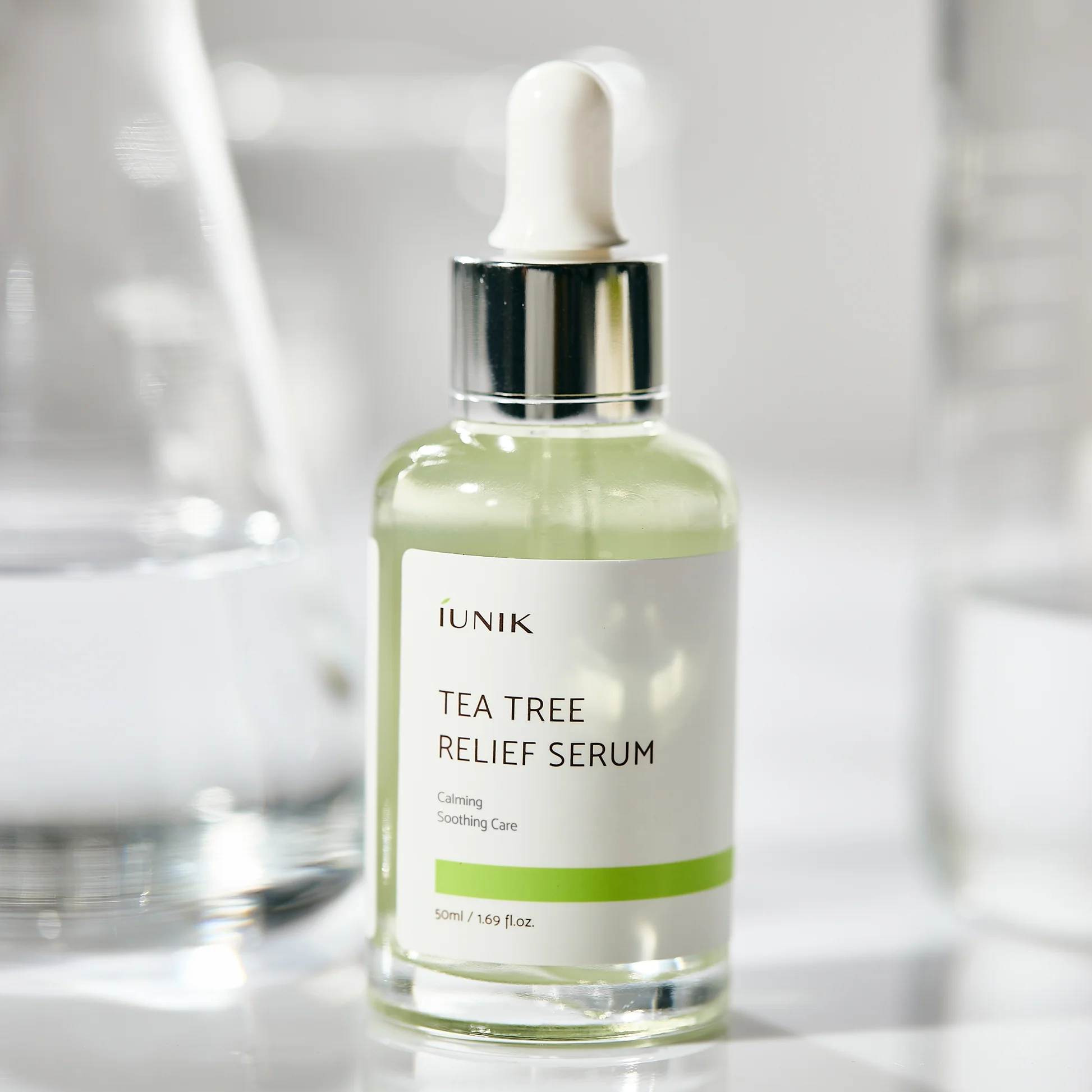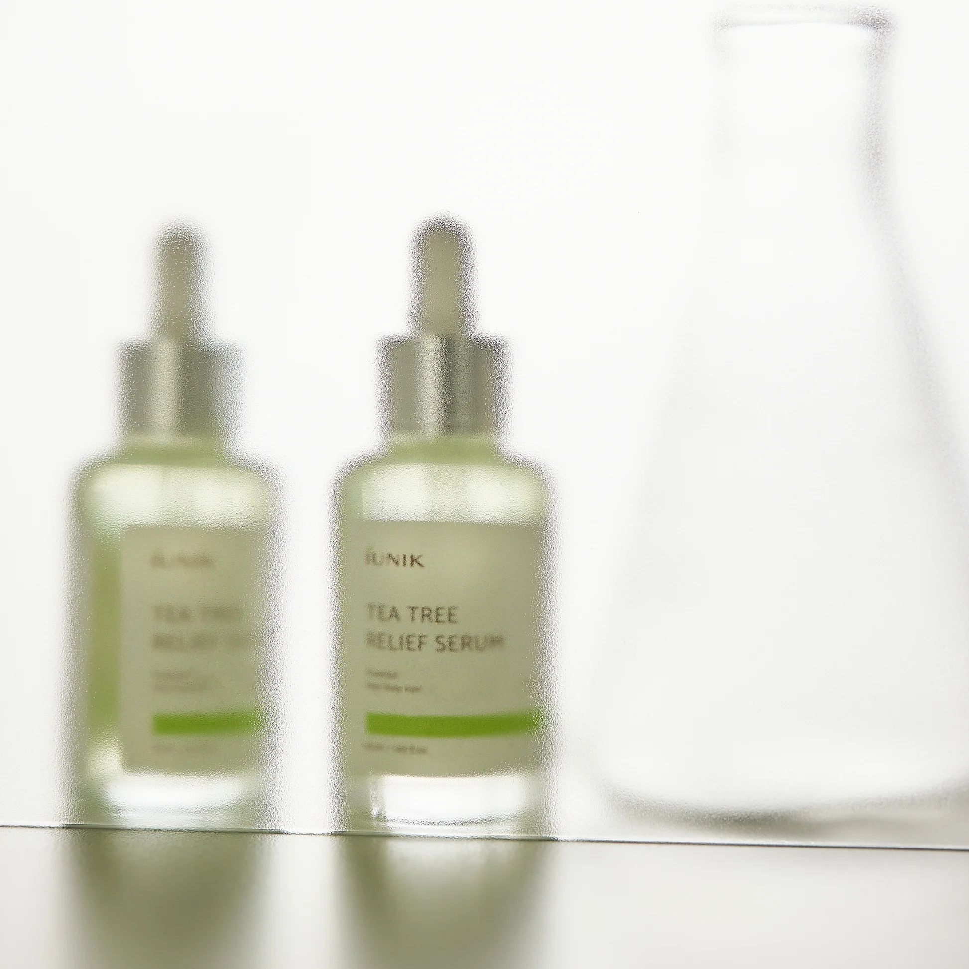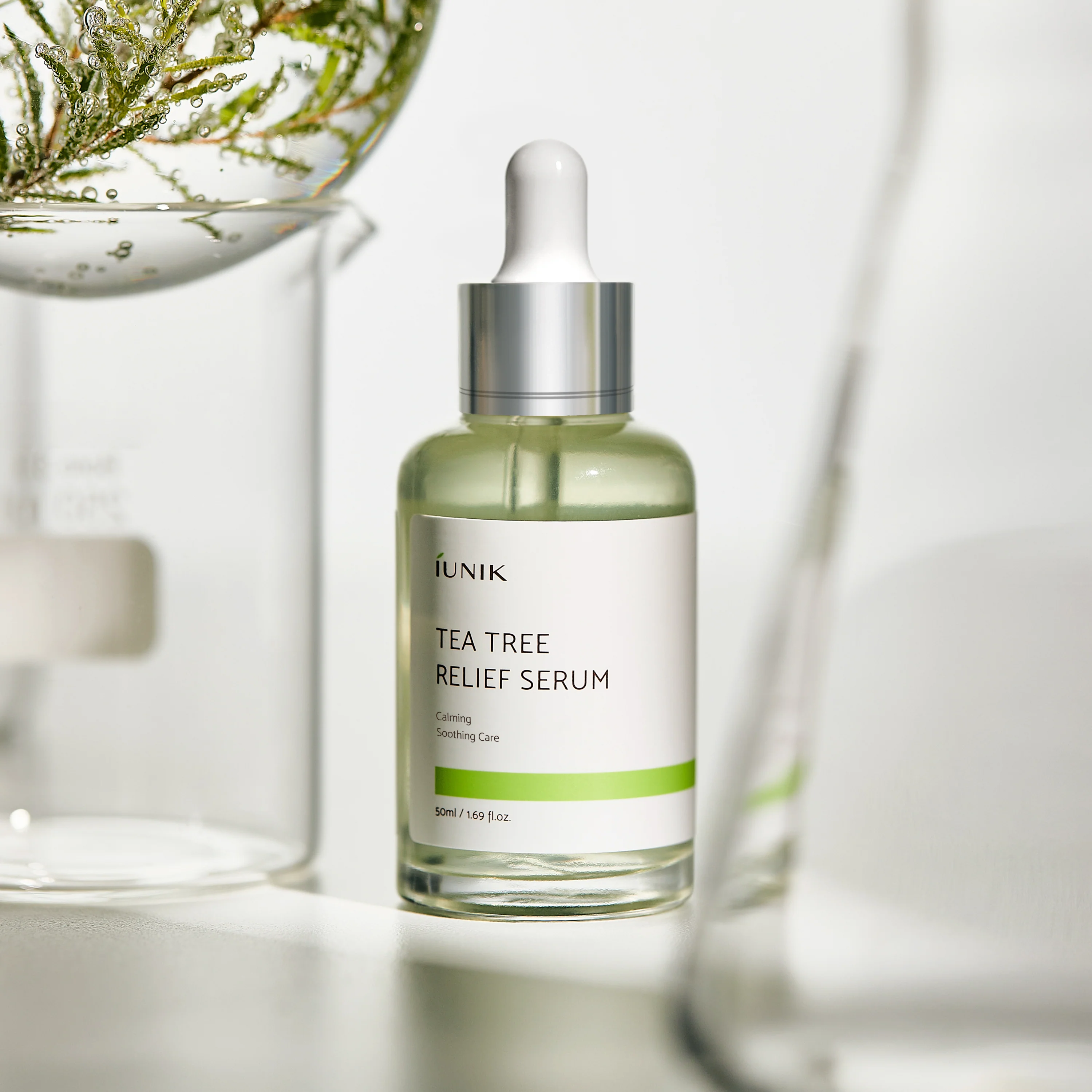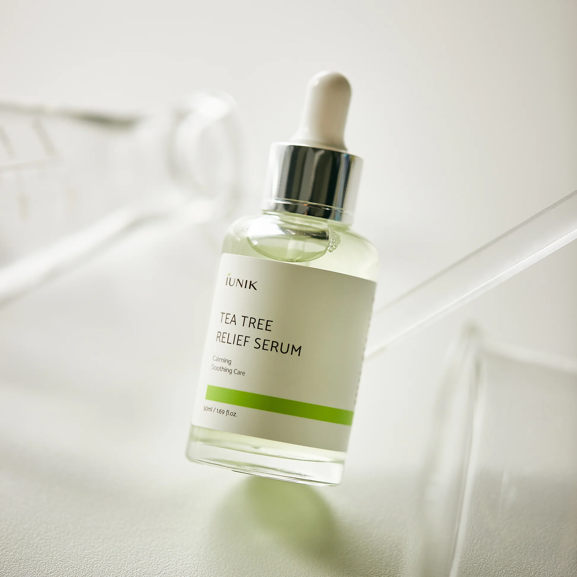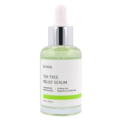 iUNIK Tea Tree Relief Serum to lekkie serum kojąco-normalizujące stworzone z myślą o cerze problematycznej, mieszanej i tłustej. Formuła z wodą z drzewa herbacianego, ekstraktem z wąkroty azjatyckiej, niacynamidem i beta-glukanem pomaga łagodzić stany zapalne, regulować wydzielanie sebum oraz wspierać bardziej jednolity i spokojniejszy wygląd skóry.